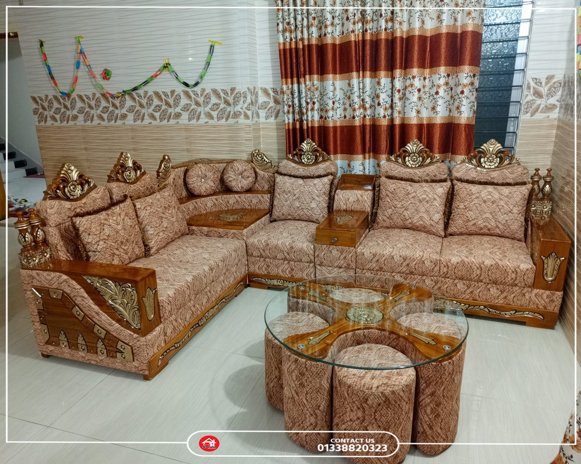 Materials: Chittagong Segun Wood + Maheguni Wood in Structure + Solid 4 inch Rubber Foam + Tarkis/Sweet Velvet Febrics + Wooden Leg.