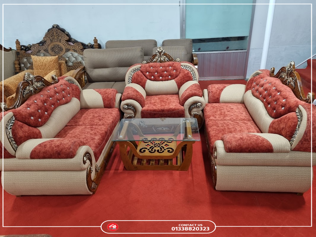 Materials: Chiittang Segun Wood + Pine Wood in Structure + Solid 4 inch Rubber Foam + Tarkis/Sweet Velvet Febrics + Jhorna Febrics + Wooden Leg.