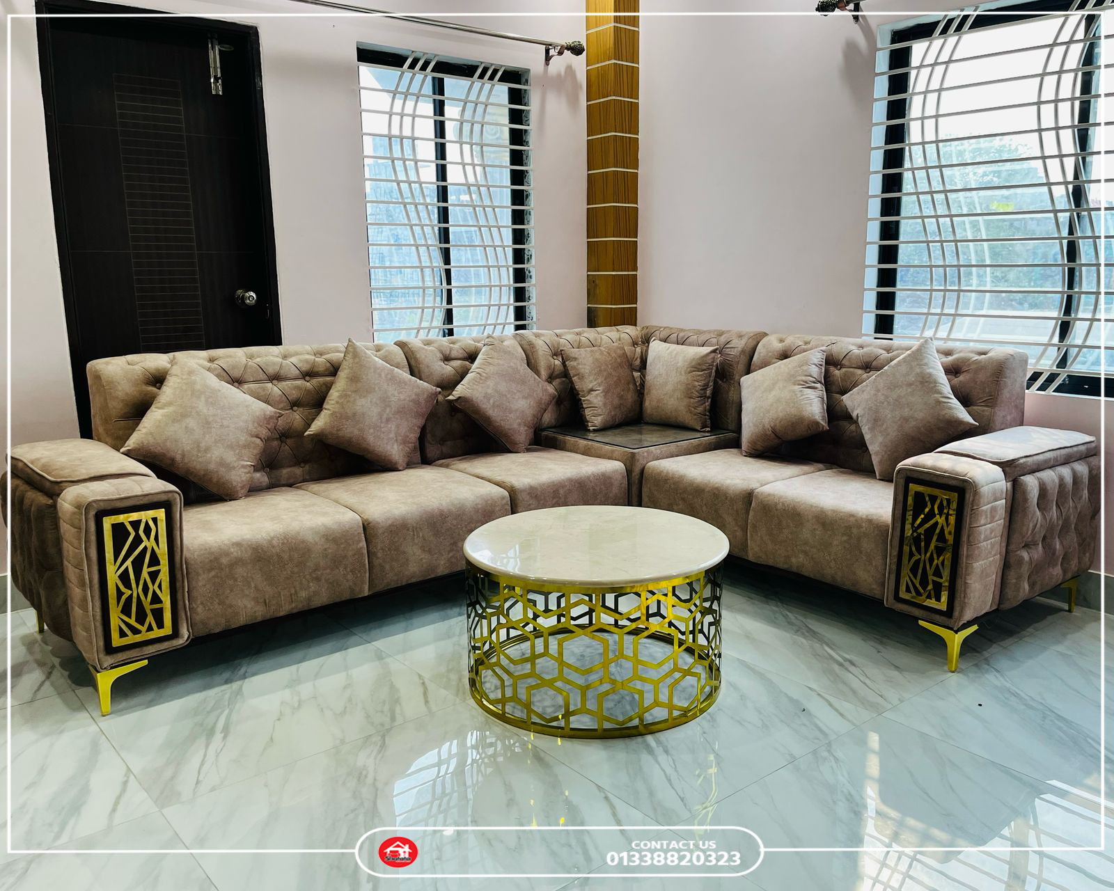 1. Corner Sofa Set + Center Table with Marvel Top