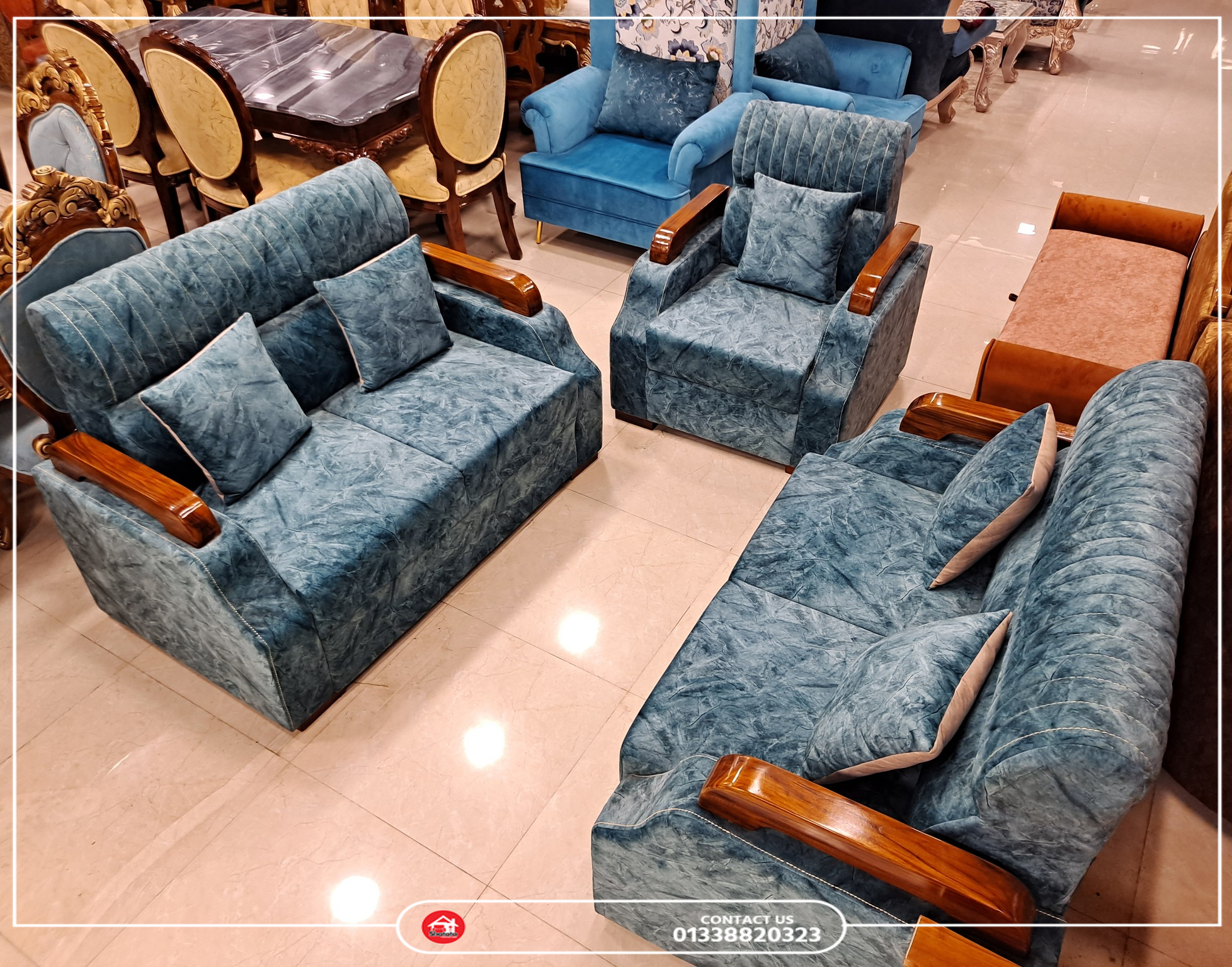 Materials: Chiittang Segun Wood + Pine Wood in Structure + Solid 4 inch Semi- Rubber Foam + Tarkis/Sweet Velvet Febrics + Wooden Leg.